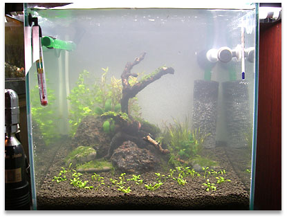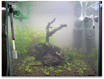 水槽セット後12時間経過して少し白濁が少しやわらいできました。