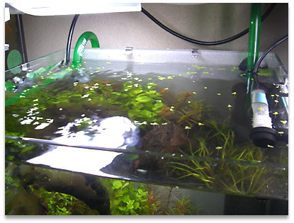 それと茶ゴケ対策として少しでも水槽内に残っている栄養素を吸収させるためにエビ水槽に浮かんでいる浮き草を入れてみました。